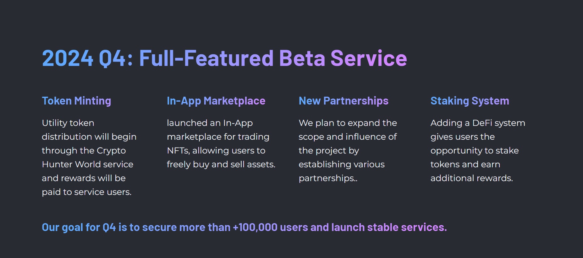 **Our goal for Q4 is to secure more than +100,000 users and launch stable services.**